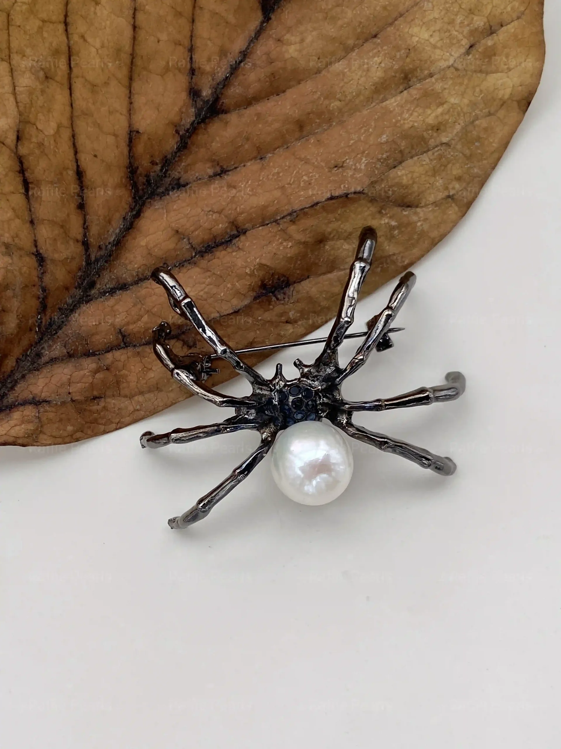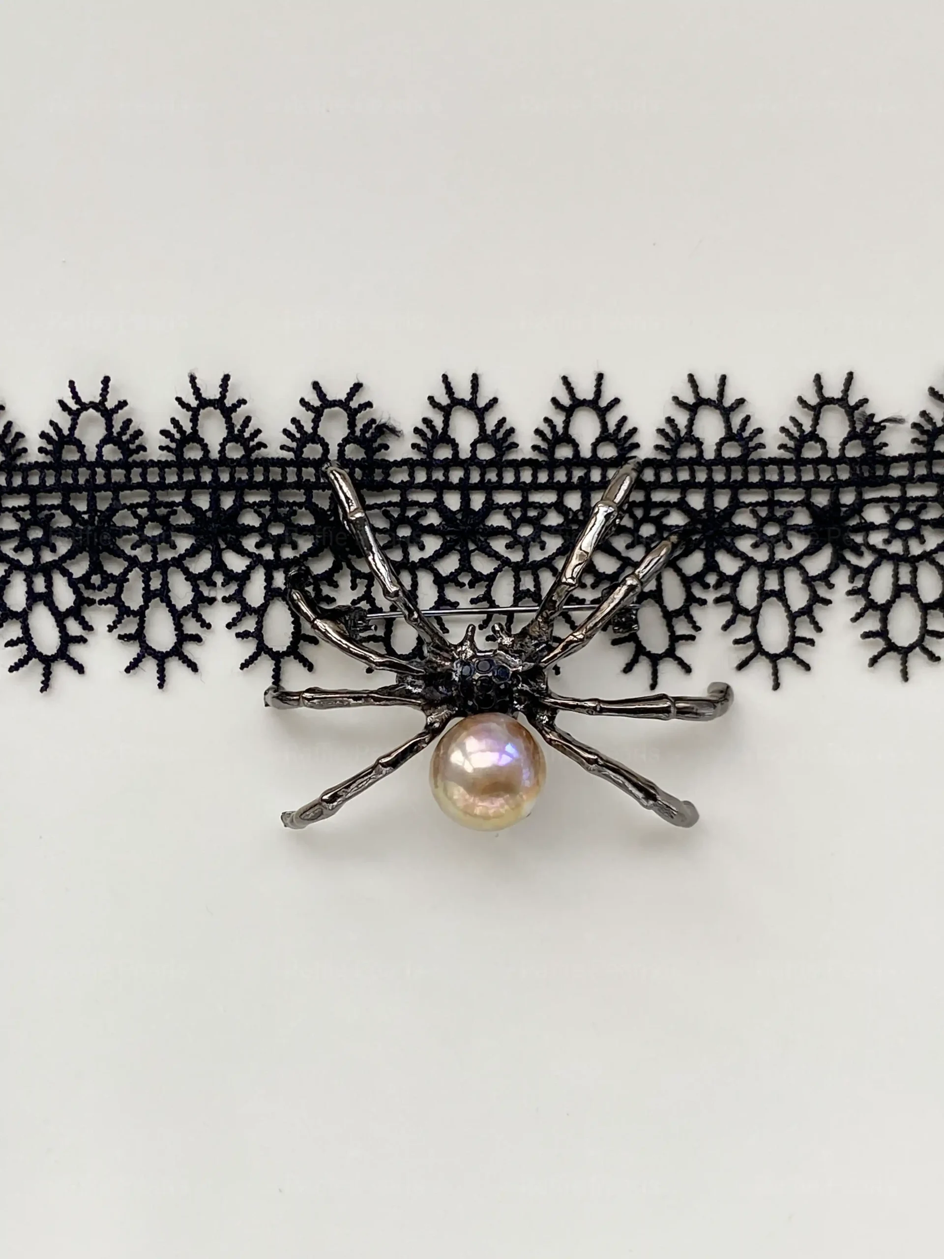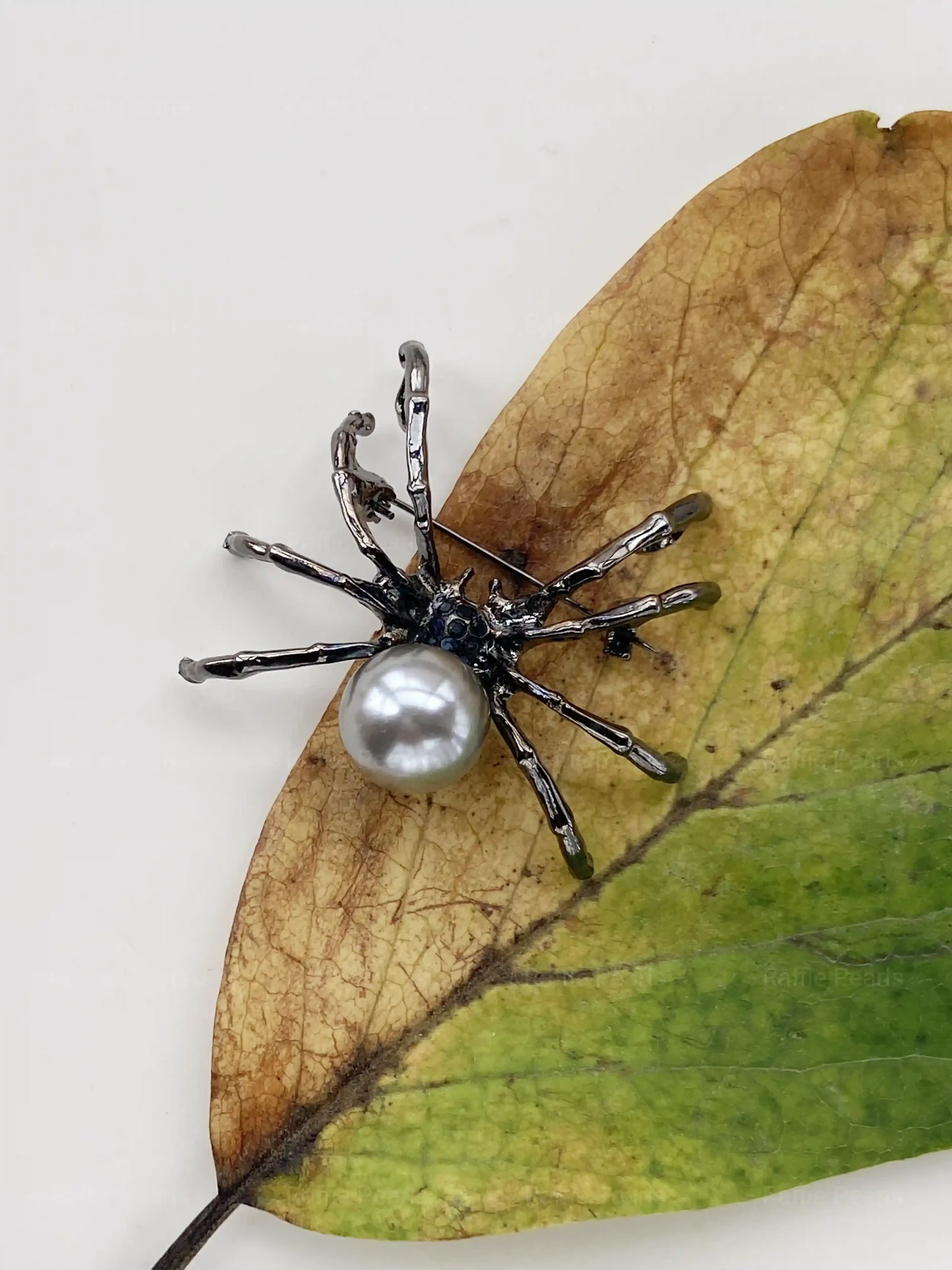 The spider’s belly features a natural pearl in your choice of white, deep purple, naturally gilt, or rich golden hues. The pearls measure from ~10mm to 13mm+. For those who love dramatic pieces, a large gray glass pearl option offers the same striking look at a more affordable price, perfect for Halloween styling.