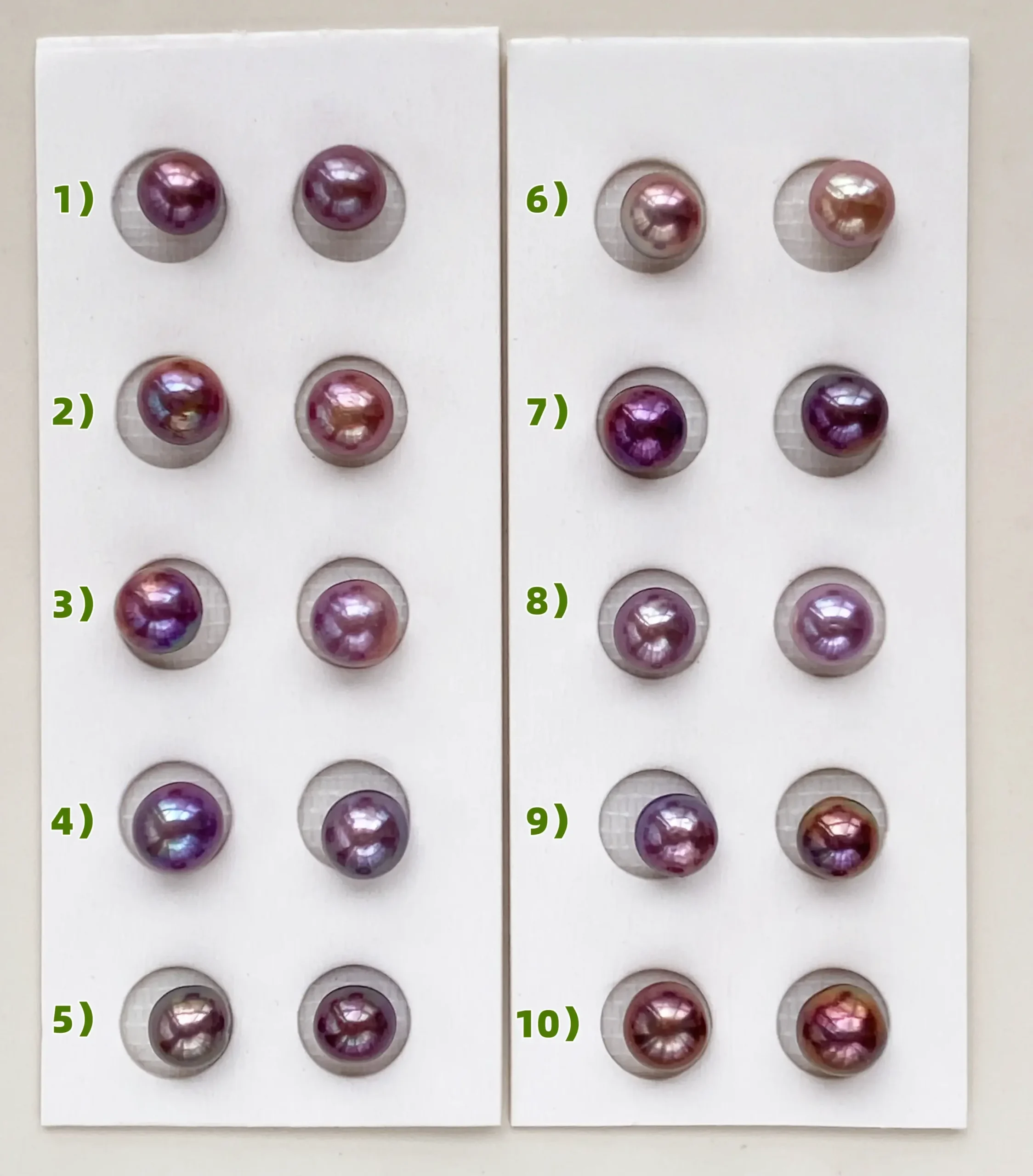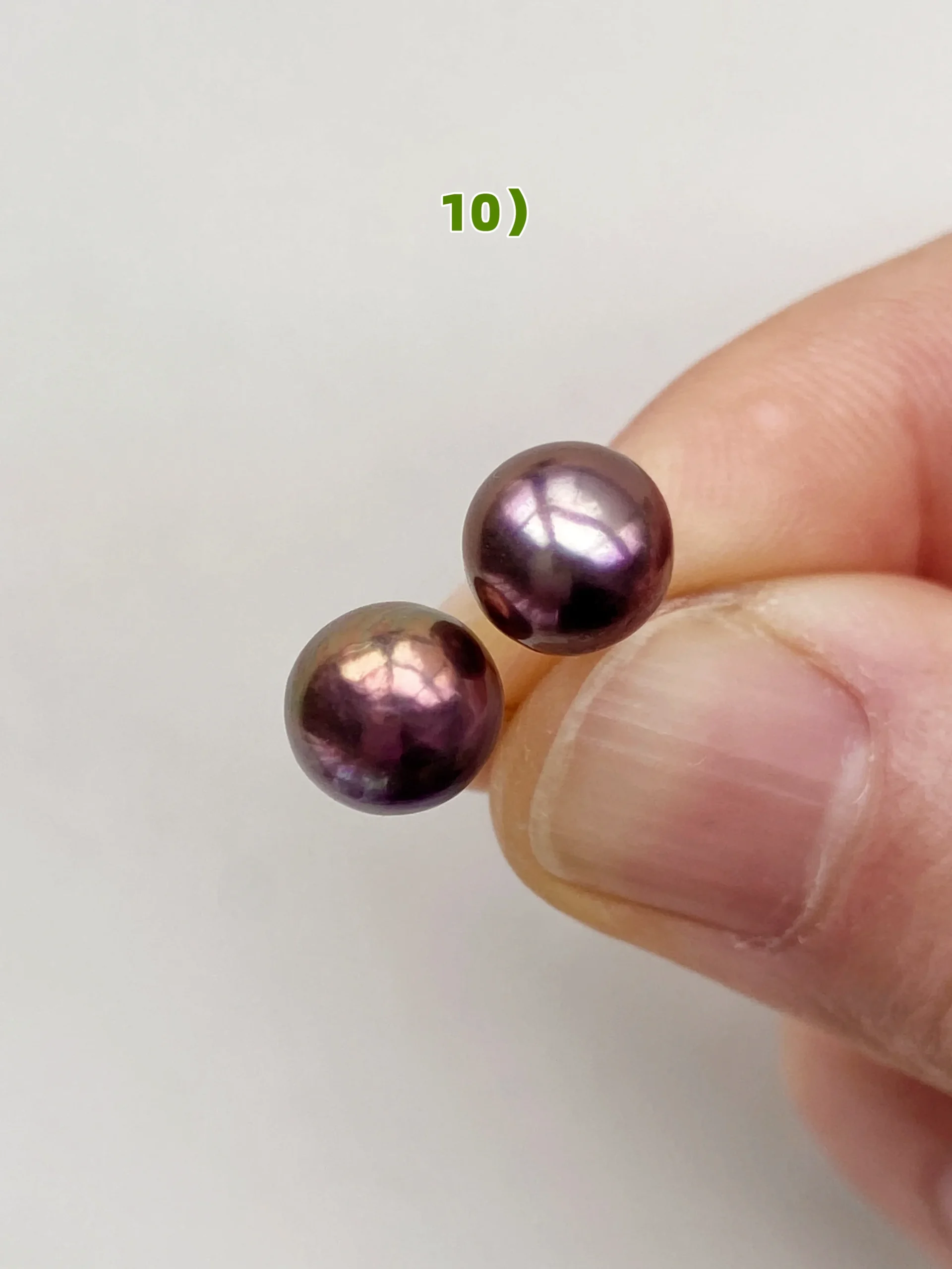 These pearls look striking from the front. Their colors are bold, luminous, and expressive. At the same time, visible imperfections often appear on the back or side of the pearls, as shown in the example photos (Pair No.10).