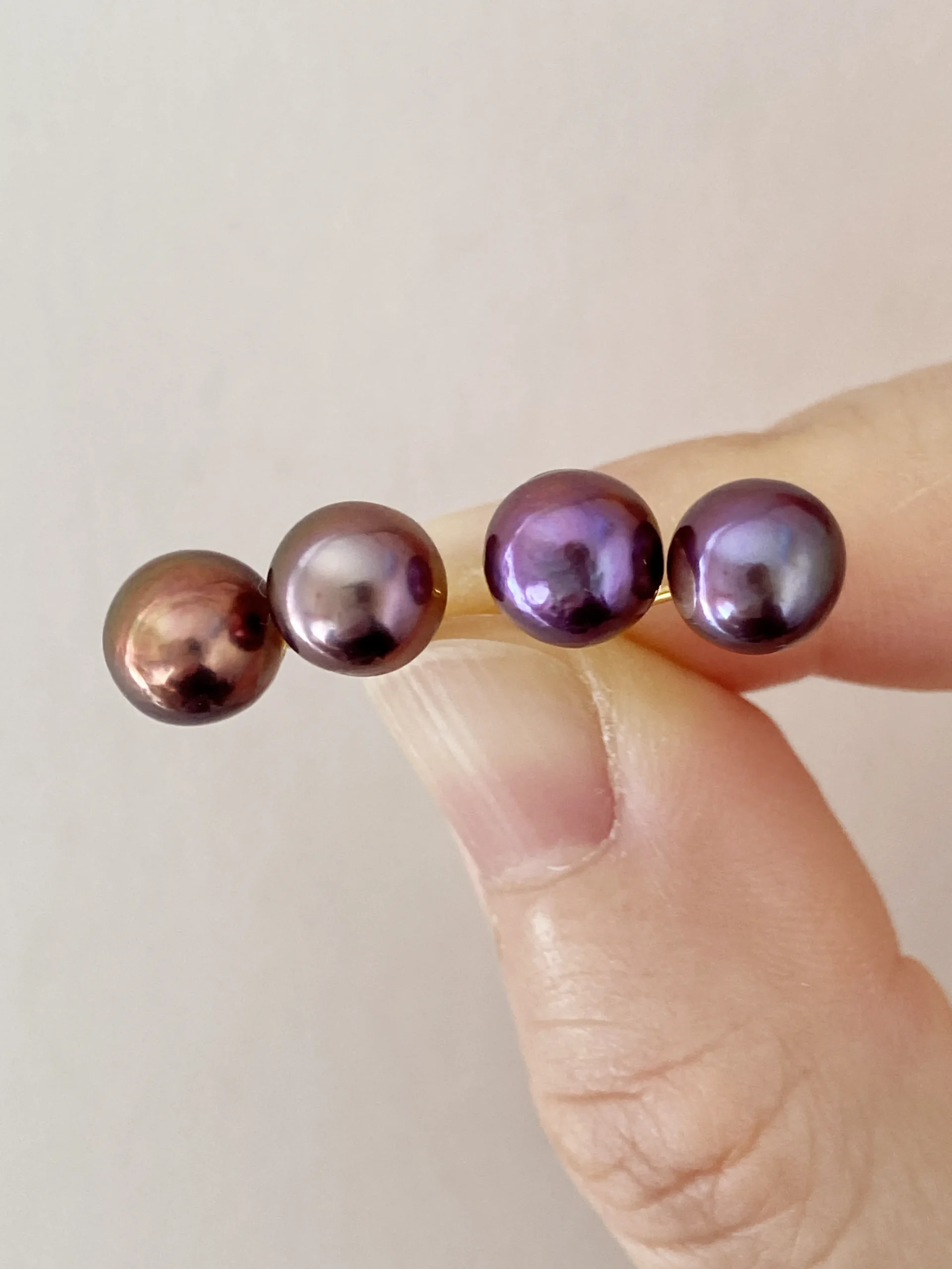 These colored pearl earrings are crafted with naturally colored freshwater pearls in rare blue-purple tones. The palette includes blueberry blue, metallic violet, deep wine red, and subtle burgundy hues. Each pearl measures approximately 7–8mm, a balanced size that works beautifully for everyday wear.