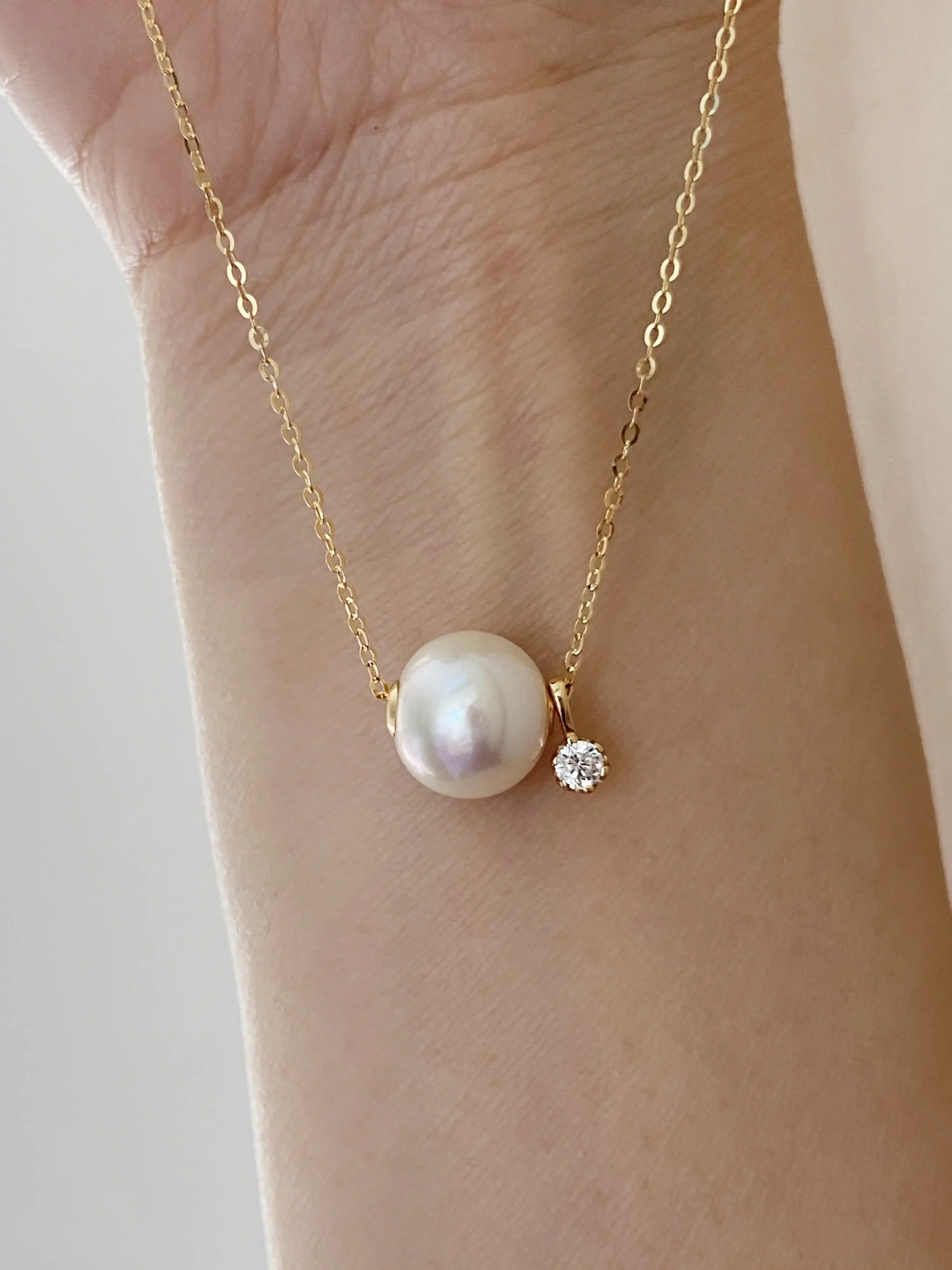 This floating pearl necklace (product code raffiepearls31) features a glowing 10~11mm Edison pearl paired with a bright zircon charm. Both elements hang gracefully from a delicate, pin-style chain in 18k gold-plated sterling silver. The minimalist design makes it perfect for layering, gifting, or wearing on its own.