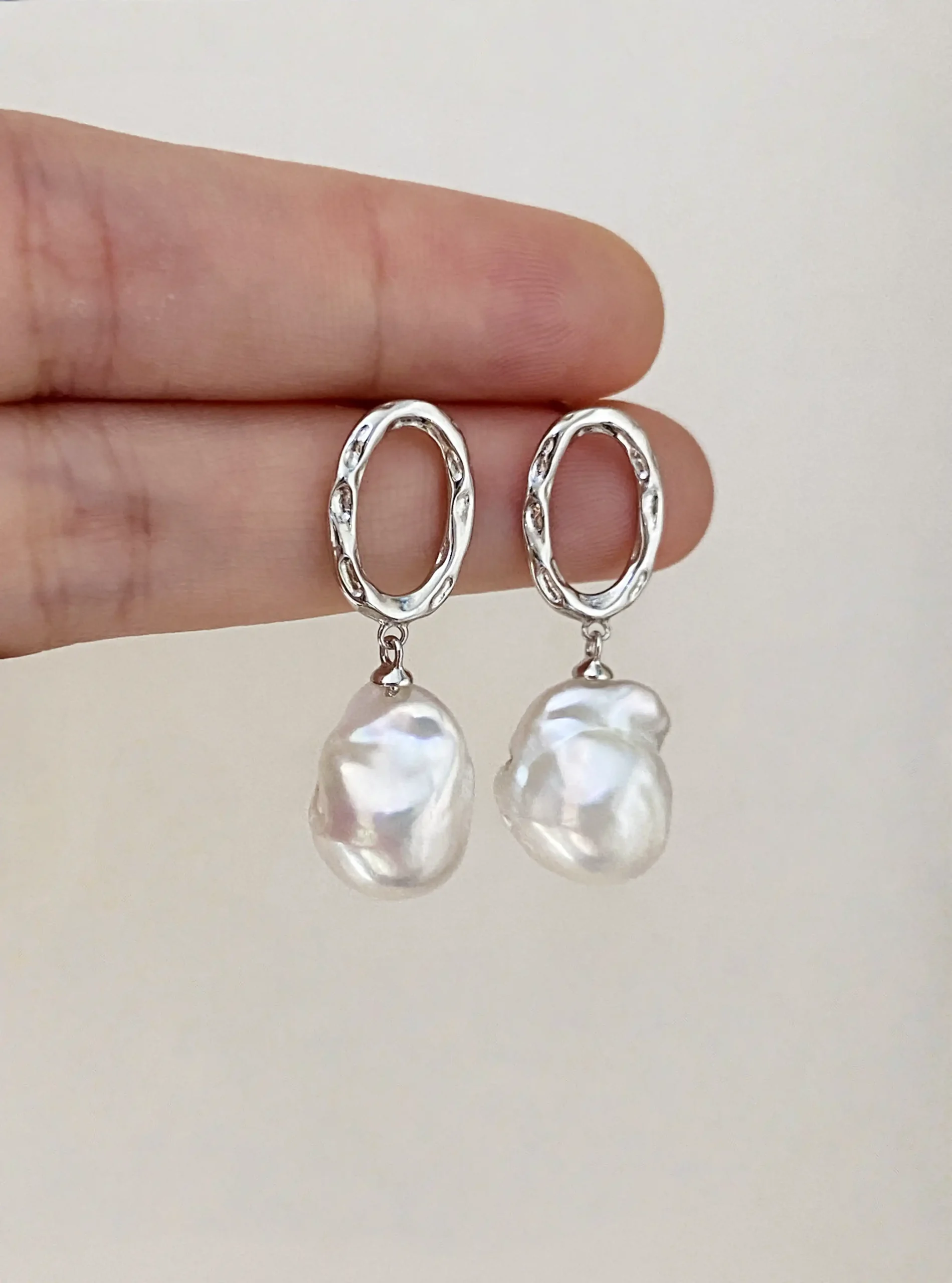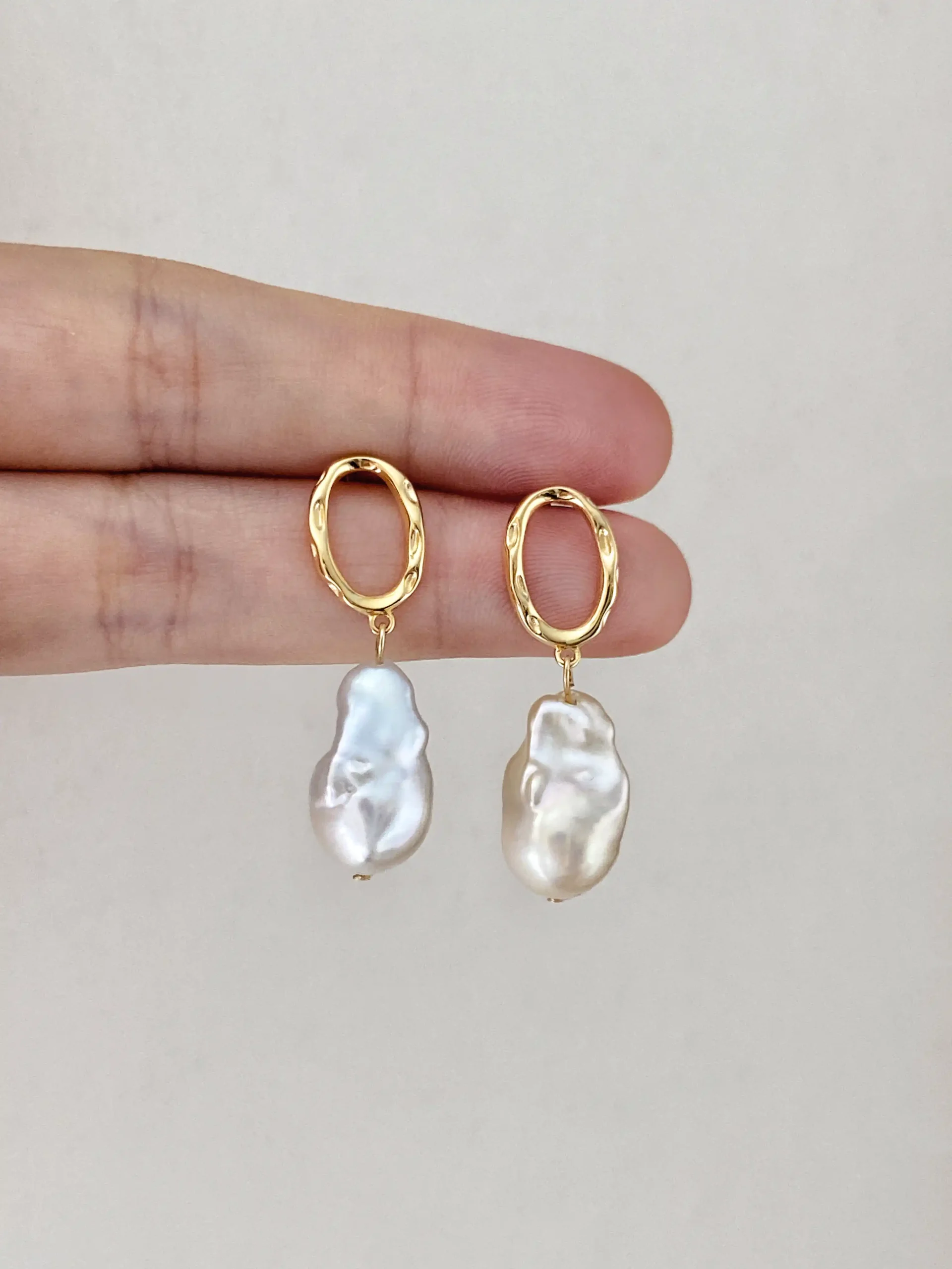 These silver or gold pearl drop earrings (product code raffiepearls26) feature luminous freshwater baroque pearls that sway elegantly from minimalist hoops. Each earring showcases a natural baroque pearl—about 15mm tall—with soft curves and a radiant, ever-changing glow. Unlike large fireball baroque pearls, these have short, rounded tails, giving them a softer, more adorable look perfect for daily wear.