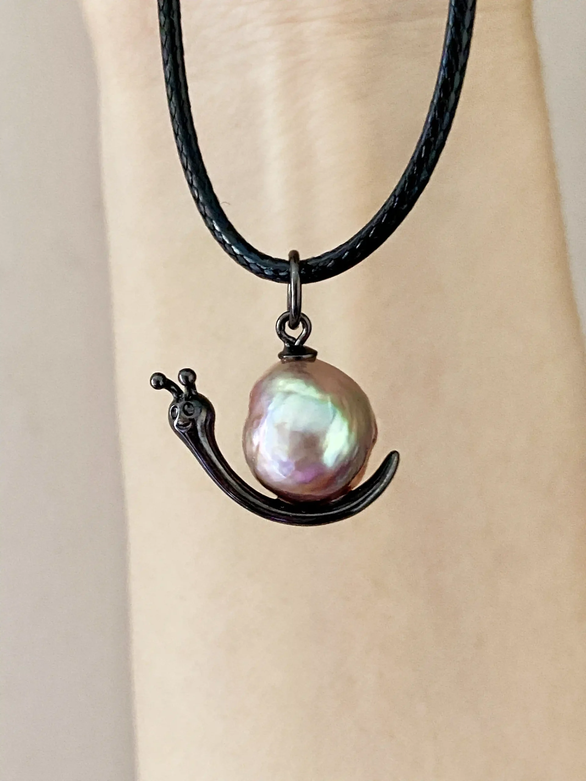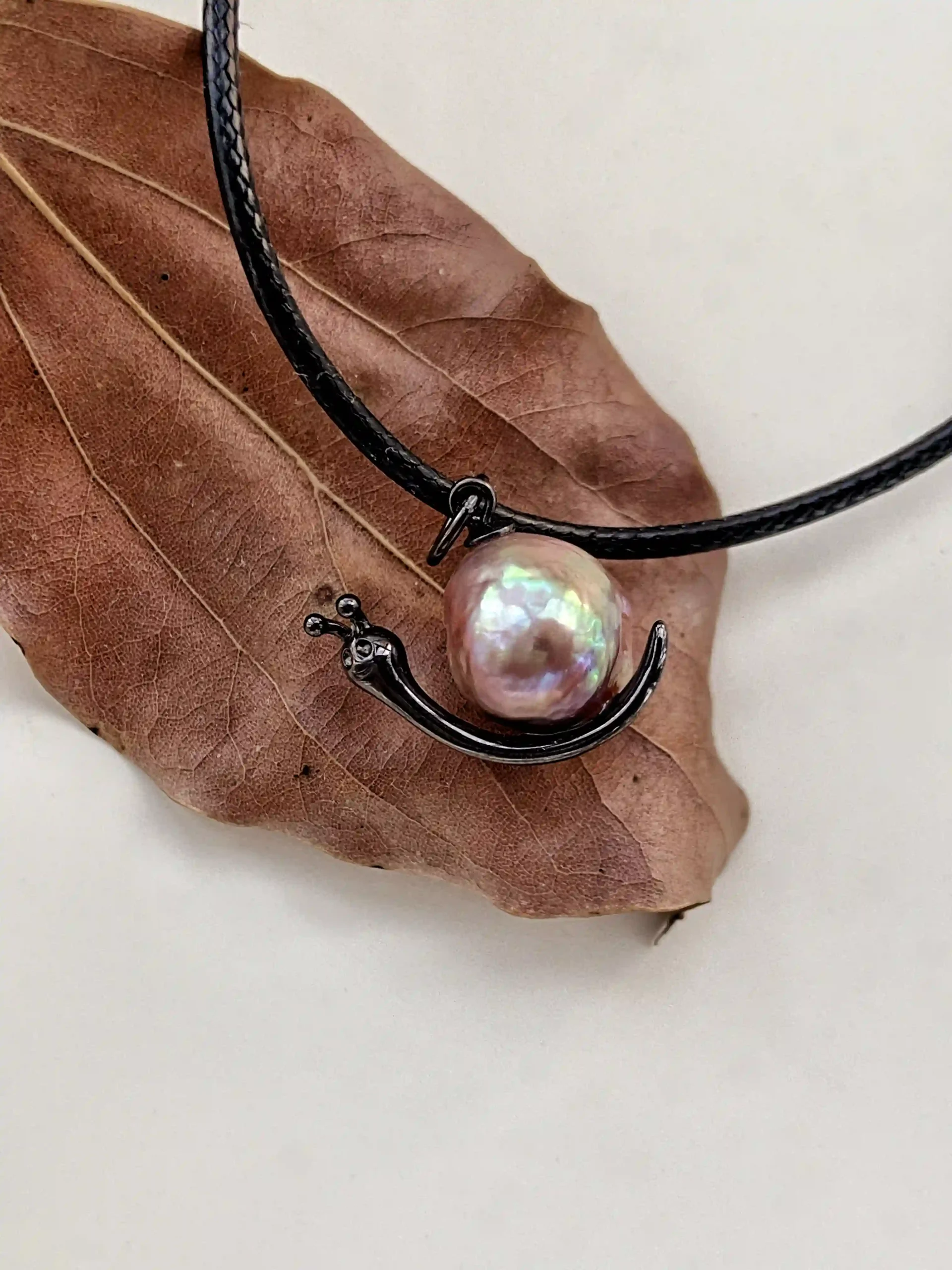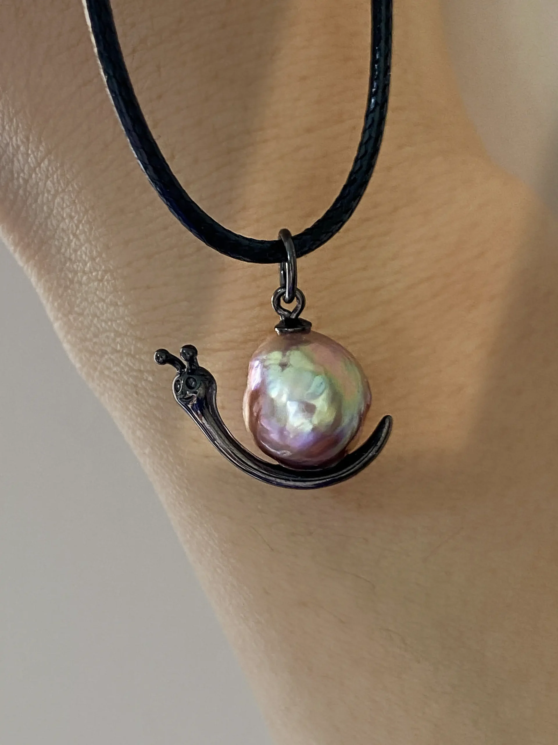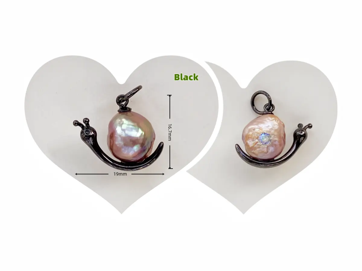 - The black-tone snail uses a lustrous freshwater baroque pearl seated in an S925 silver frame plated with black rhodium. Its colors shift between green, purple, red and deep gold under different light, letting you discover a new mood every day. Black rhodium plating helps the silver resist oxidation and keeps the finish bright for longer.
