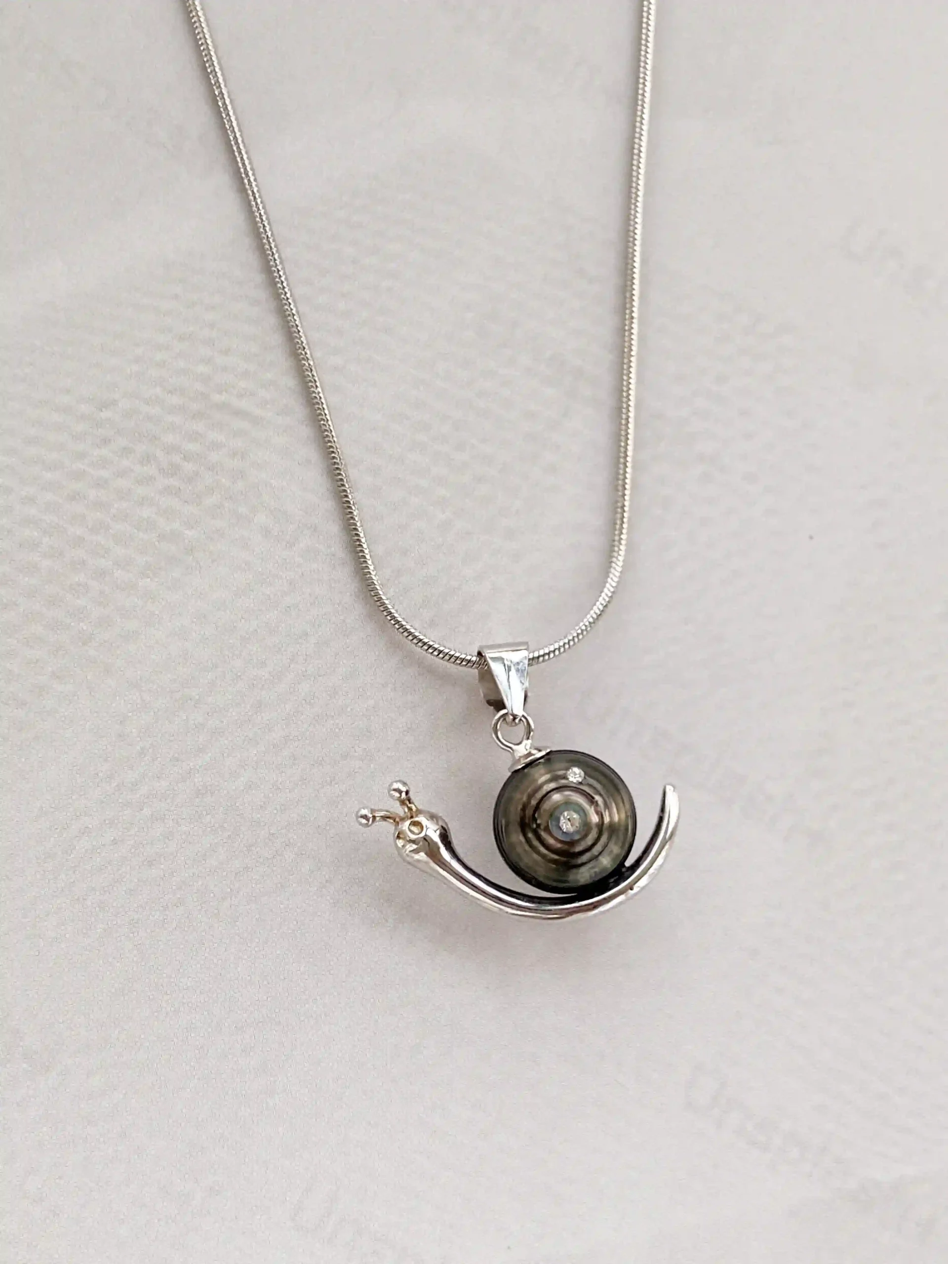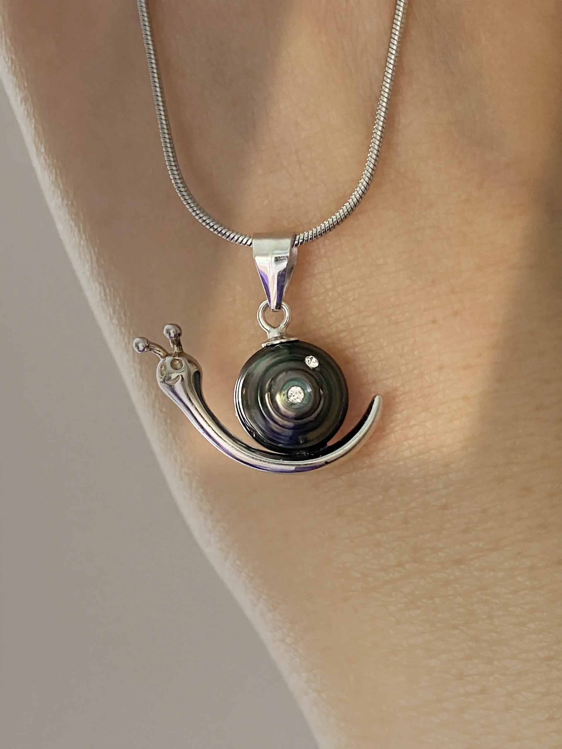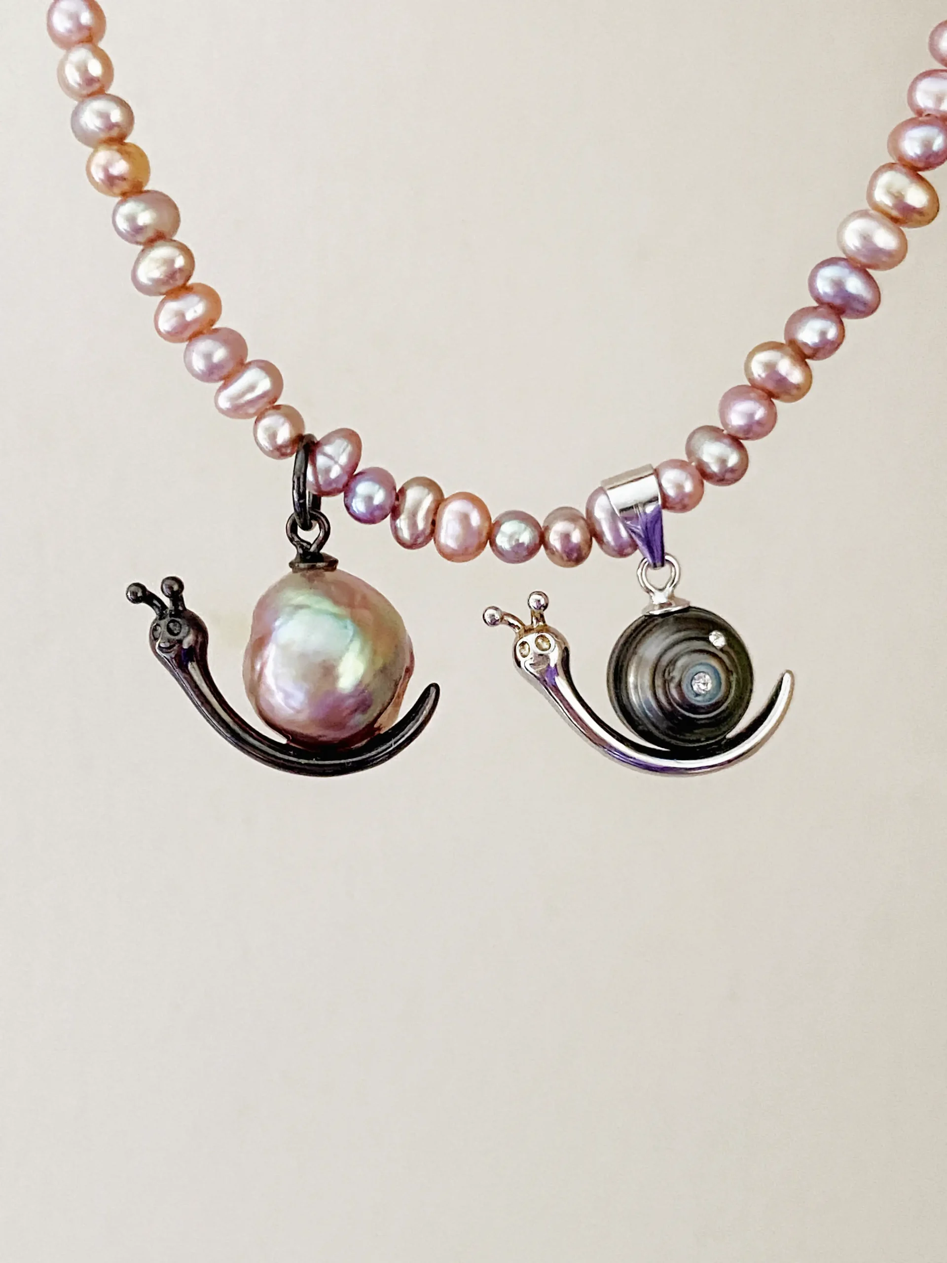 Our snail necklace designs blend whimsy with true craftsmanship. Each piece features a real, naturally colored pearl set in a playful yet elegant sterling silver snail silhouette.