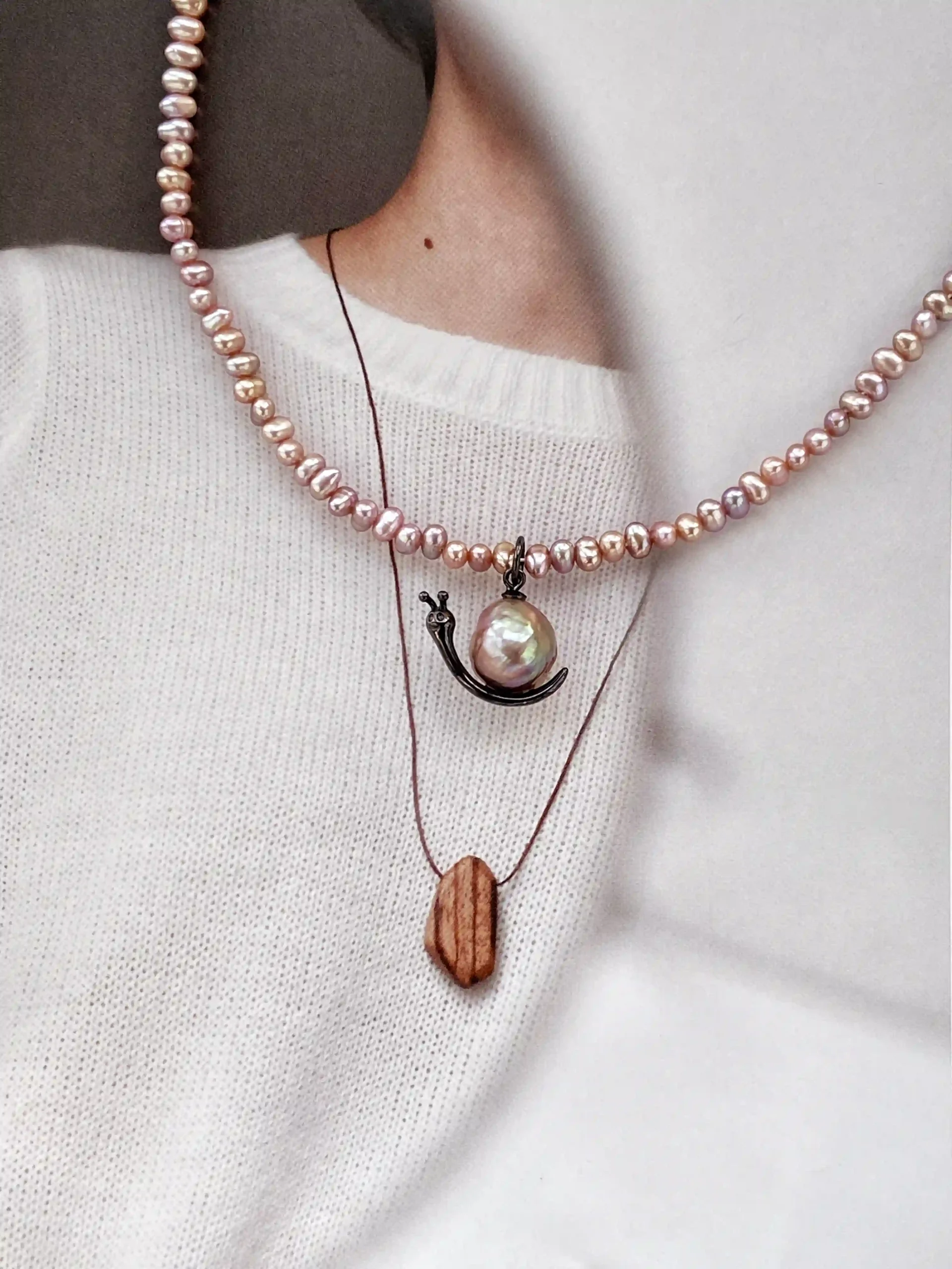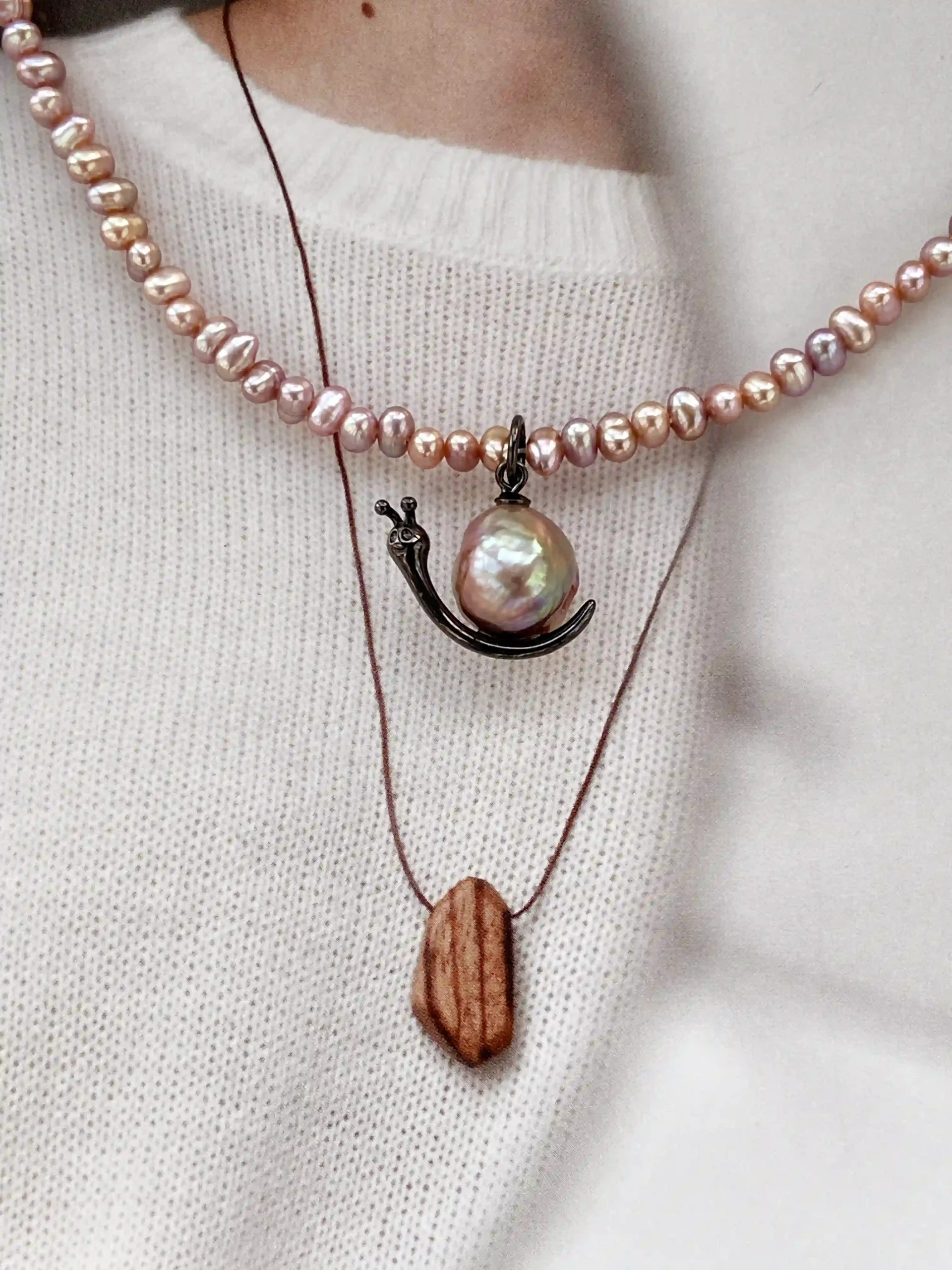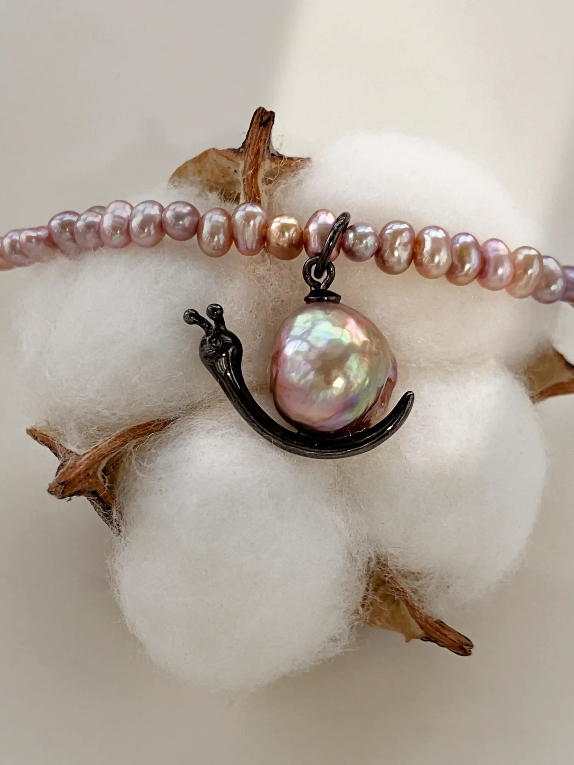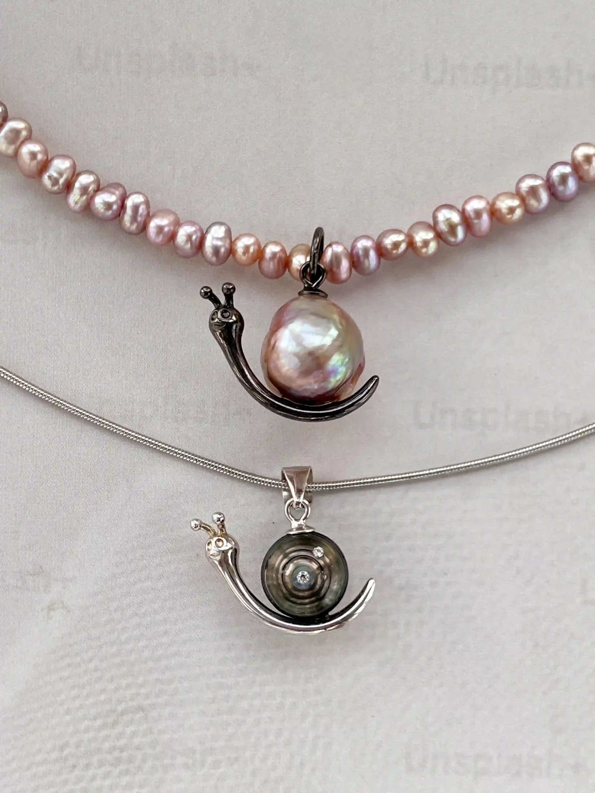 Our snail necklace designs blend whimsy with true craftsmanship. Each piece features a real, naturally colored pearl set in a playful yet elegant sterling silver snail silhouette.