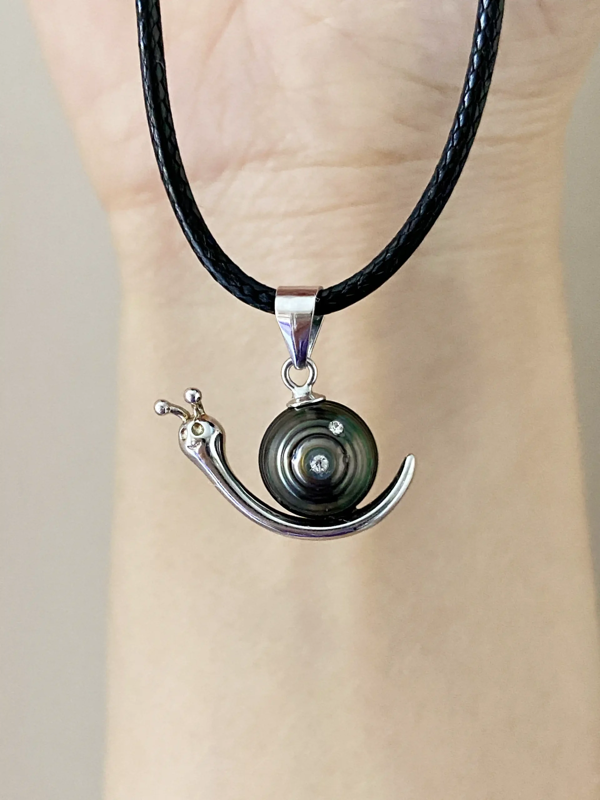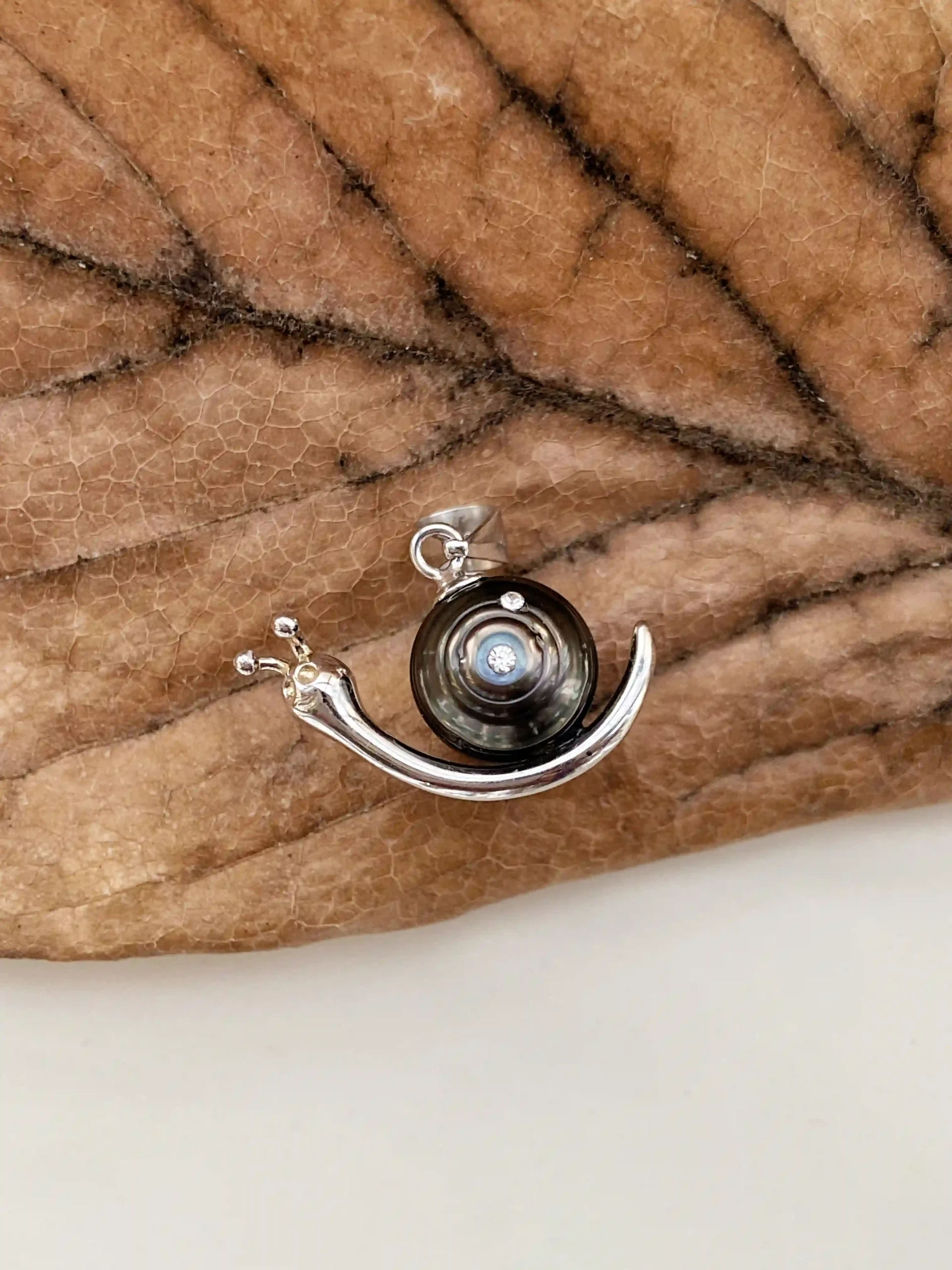 - The silver-tone snail features a naturally swirled Tahitian pearl nested in S925 silver plated with white rhodium. Tiny Swarovski crystals add a subtle sparkle to the shell, giving the charm a refined accent.
