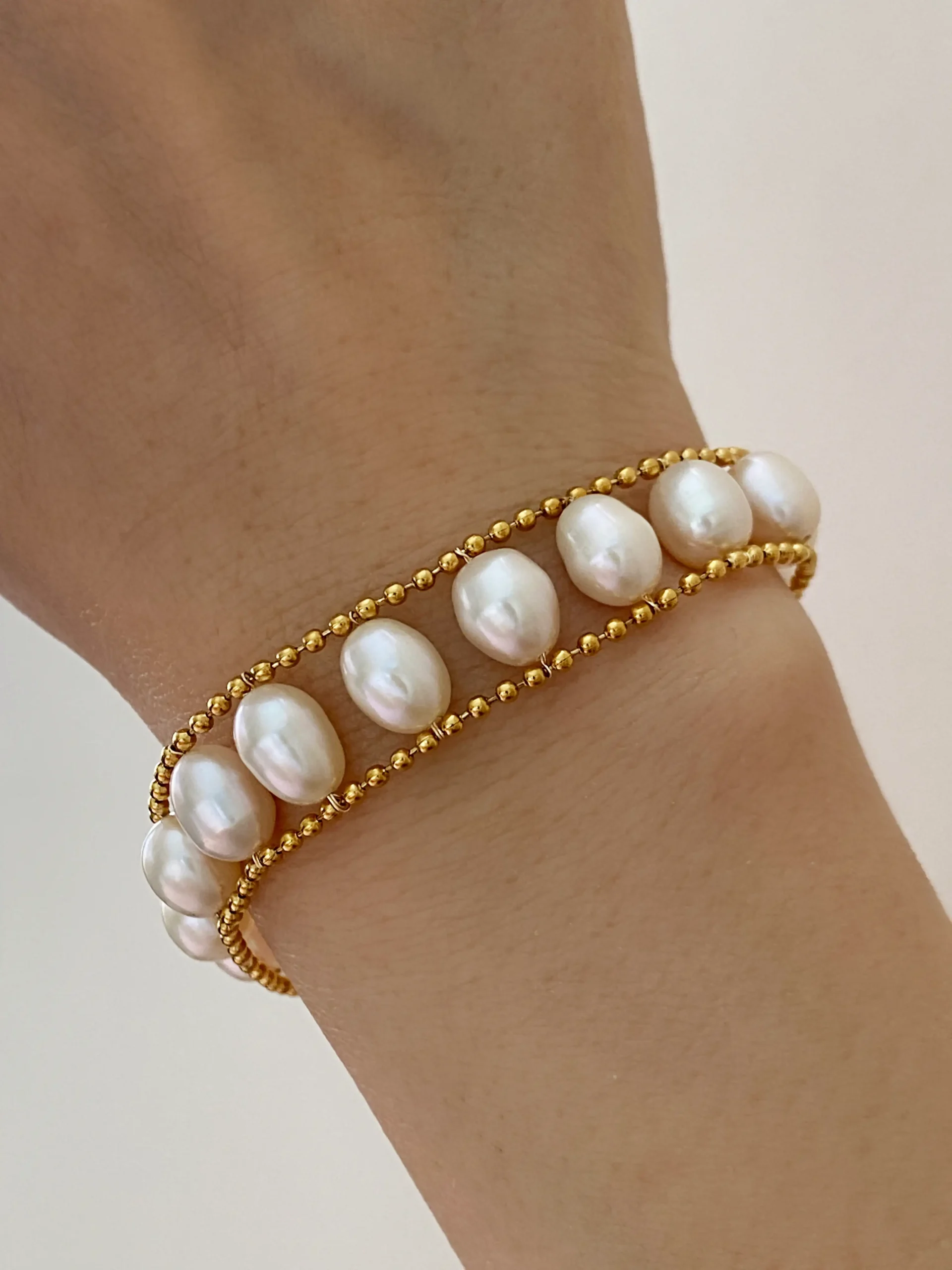 Delicate and timeless, this pearl bracelet wedding essential is a statement of understated elegance. It combines luminous freshwater pearls (~8mm x 6mm) with a fine gold-plated chain, offering a balance of modern minimalism and classic charm. Whether worn daily or styled with a formal gown, this freshwater pearl bracelet adds effortless refinement to any outfit.