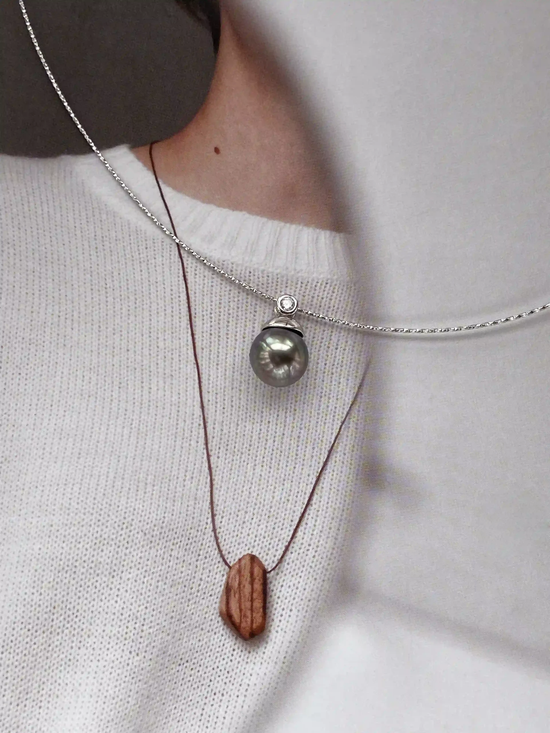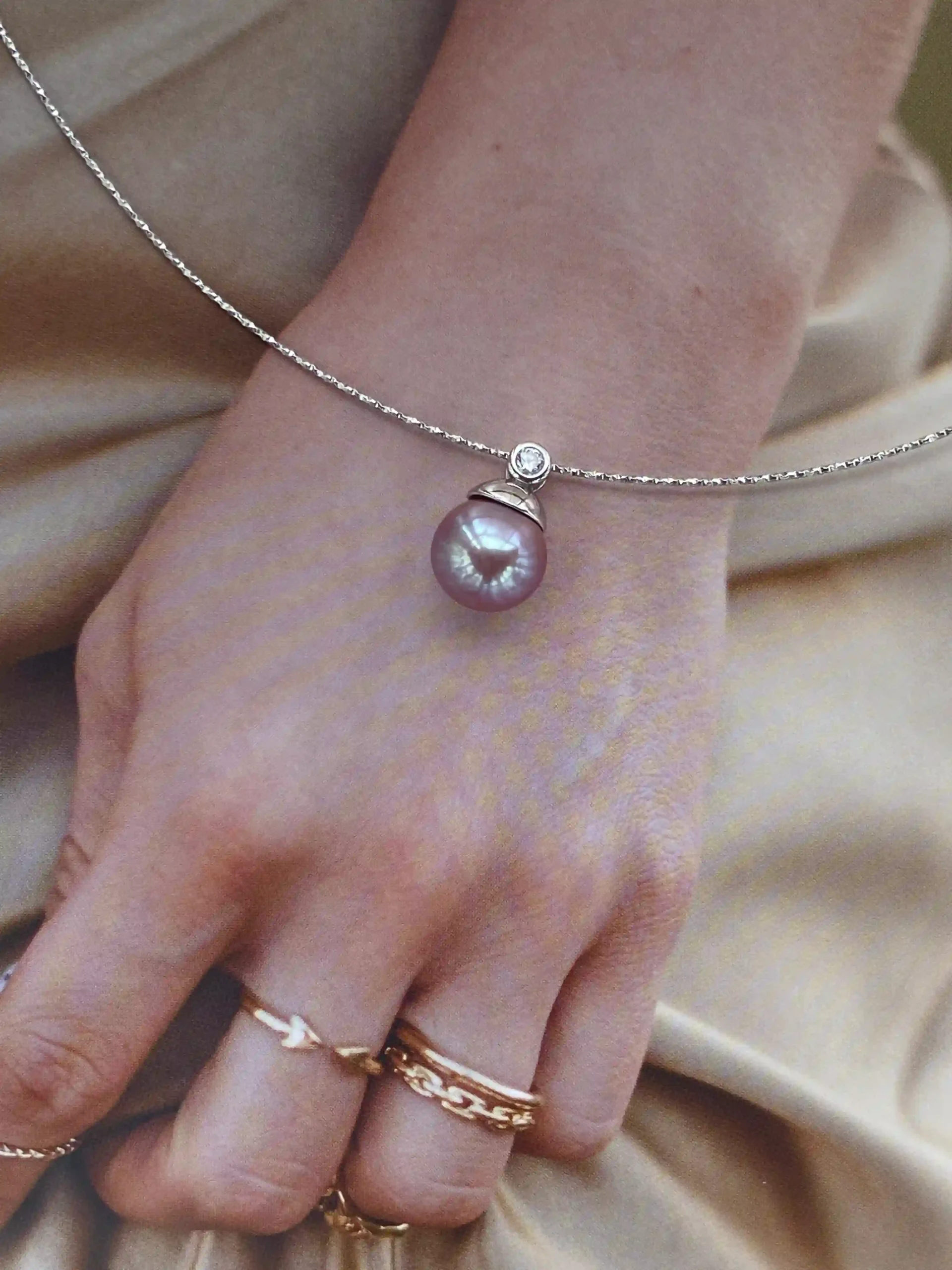 Pearl quality is judged primarily by luster and overtone (source: GIA – Pearl Quality Factors). We use only untreated natural pearls with excellent luster and rich overtones. White pearls may glow with soft pink, champagne, or blue overtones. Purple pearls lean toward pink or bluish hues. Black Tahitian pearls may reveal peacock purple, peacock blue, or the rare and most prized peacock green. If you’re into classic pearl vibes, explore our Round/ Near Round Pearl Jewelry Collection.