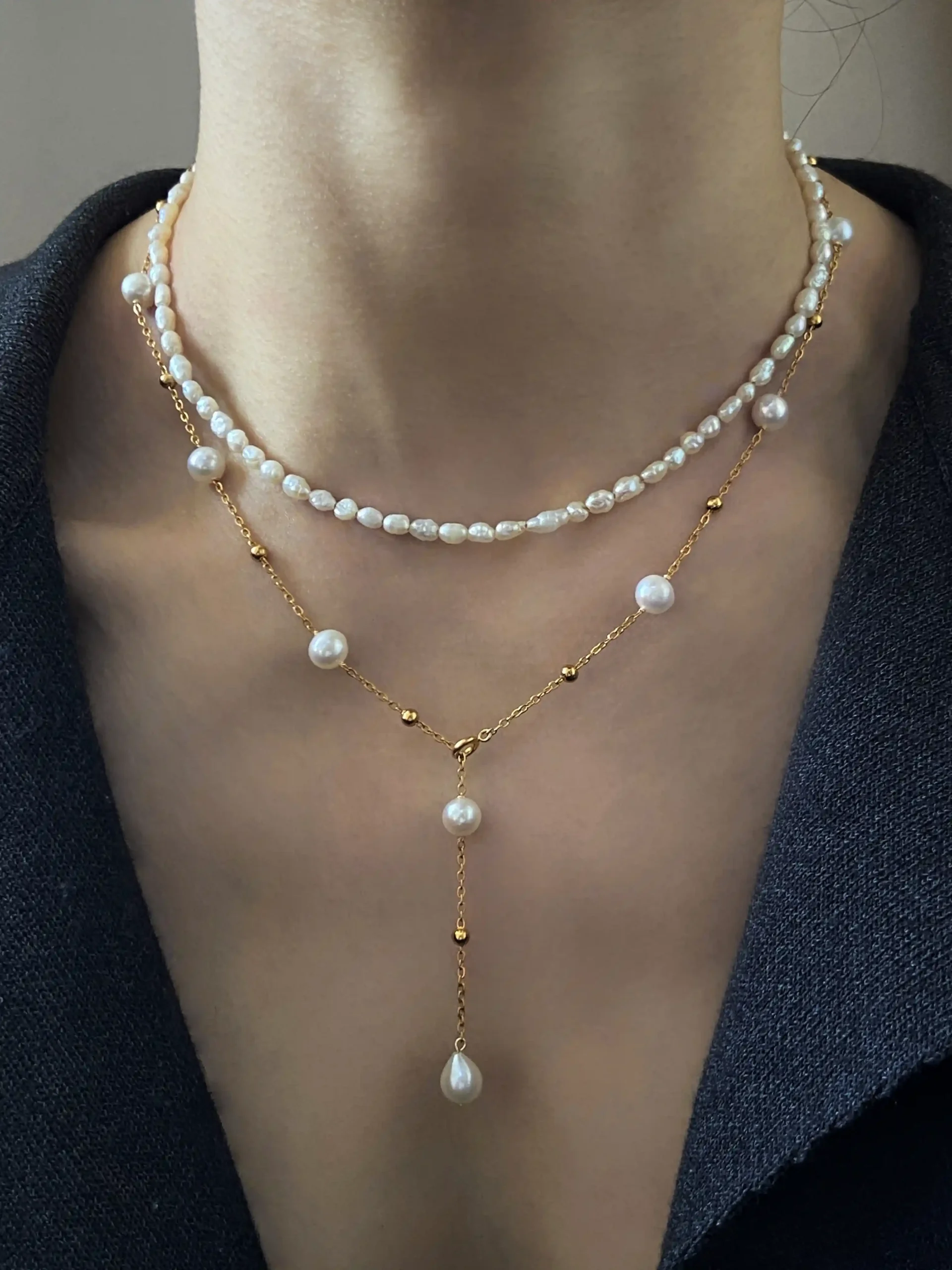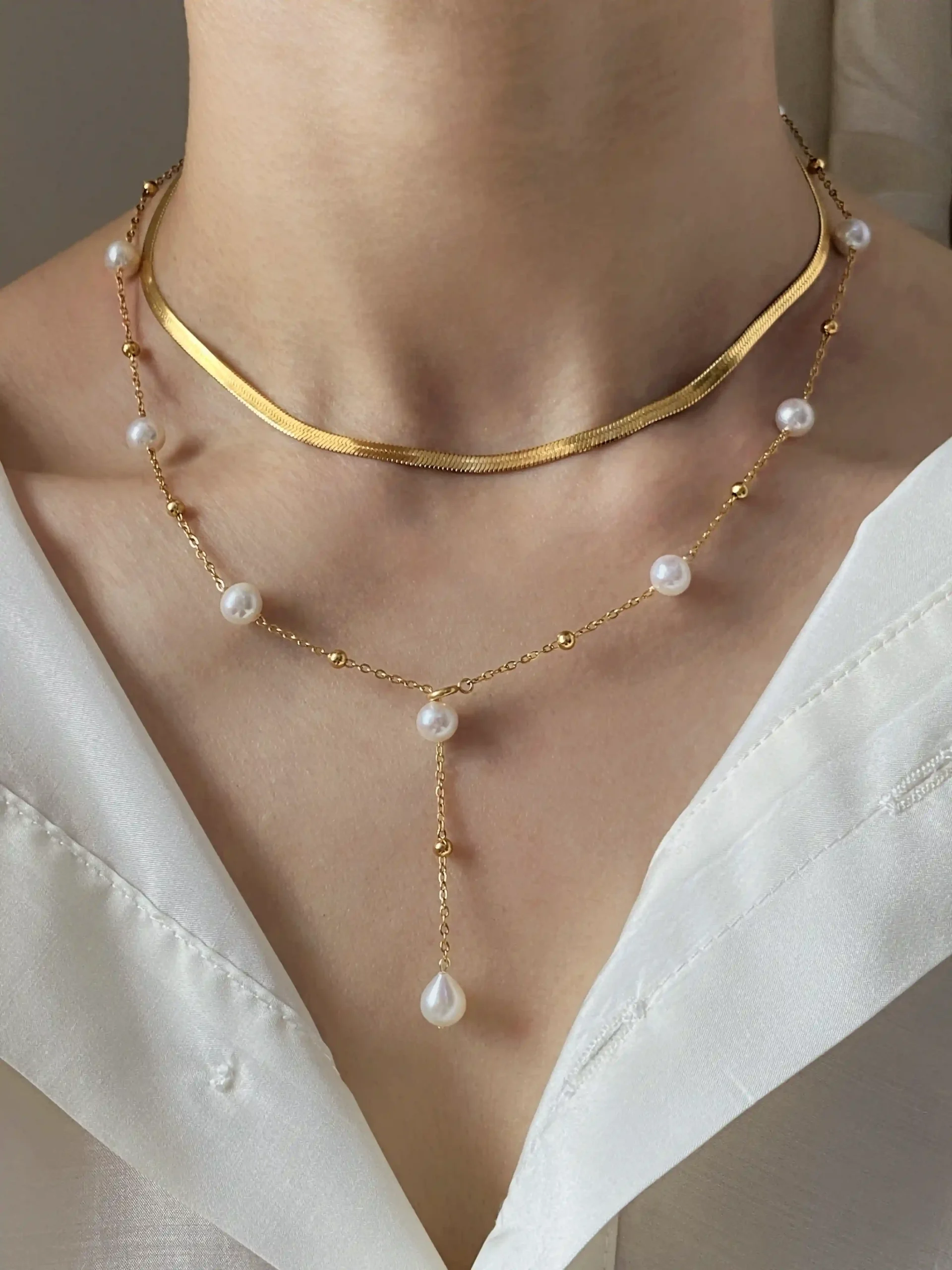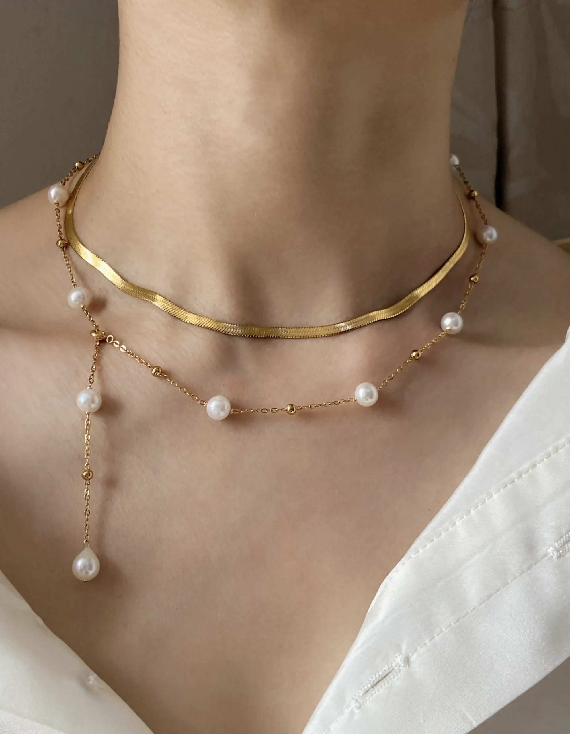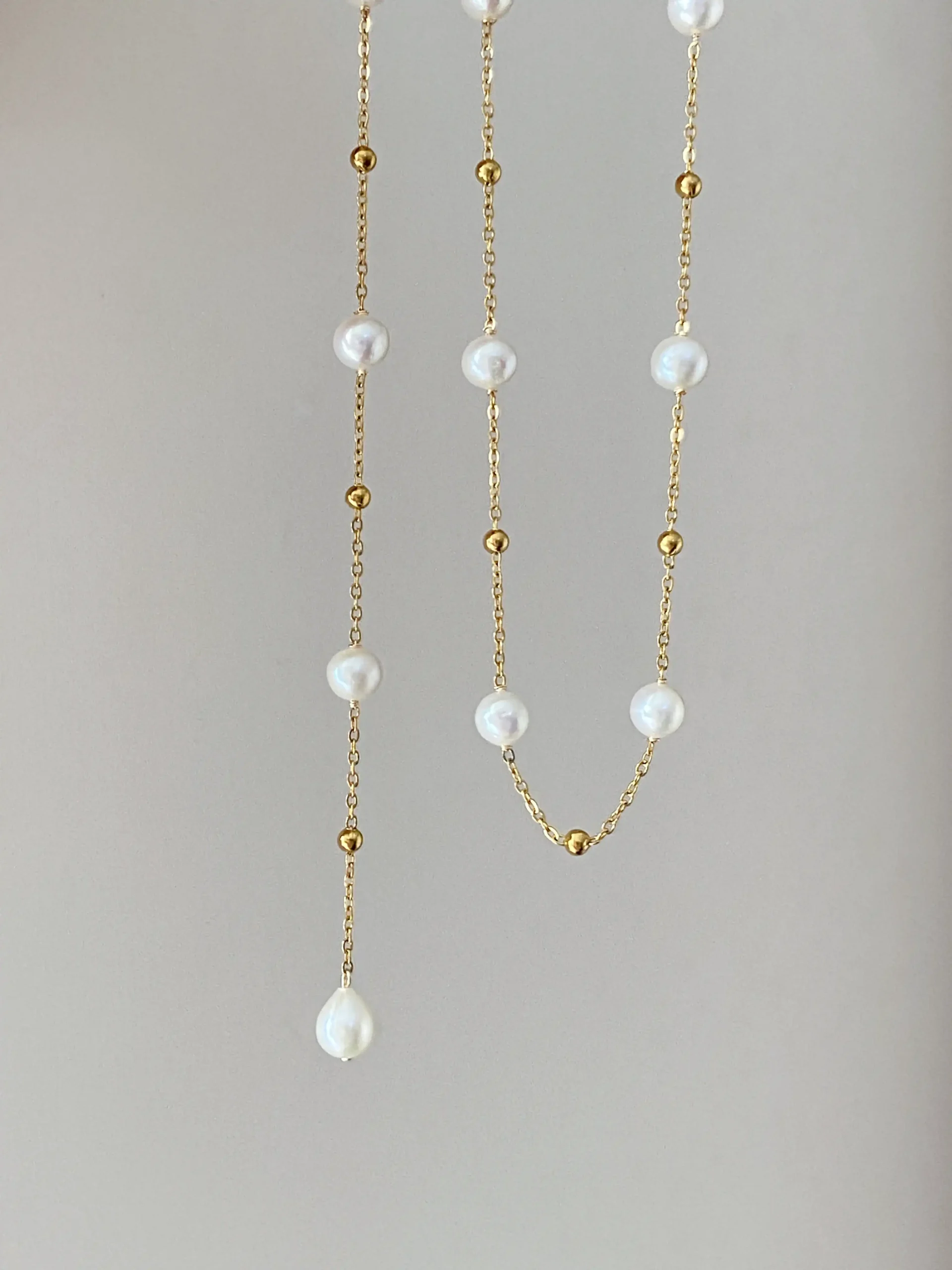 The most unique detail is the dainty spring clasp, crafted in gold PVD-plated stainless steel. It lets you fasten the chain anywhere—on a pearl or a gold bead. Wear it as a choker, a Y-necklace, a mid-length chain, or wrap it into a bracelet with the teardrop pearl as a pendant.